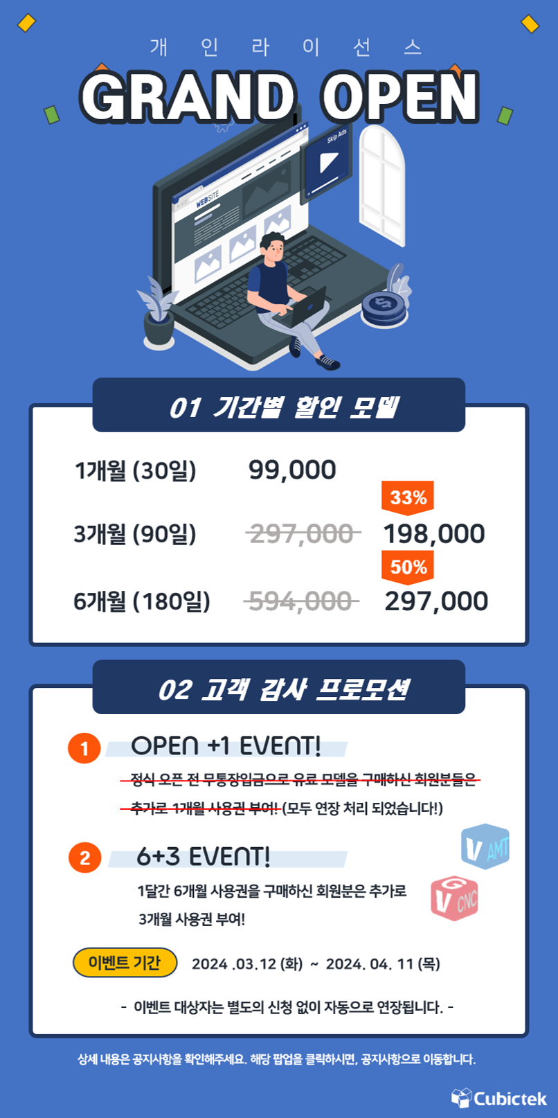 저희 큐빅테크의 자체 개발 솔루션, GV-CNC와 V-AMT에 대한 과분한 사랑을 주셔서 감사합니다! 이에 정식 개인용 라이선스 서비스 오픈에 맞춰 오픈 이벤트를 몇 가지 준비했습니다!